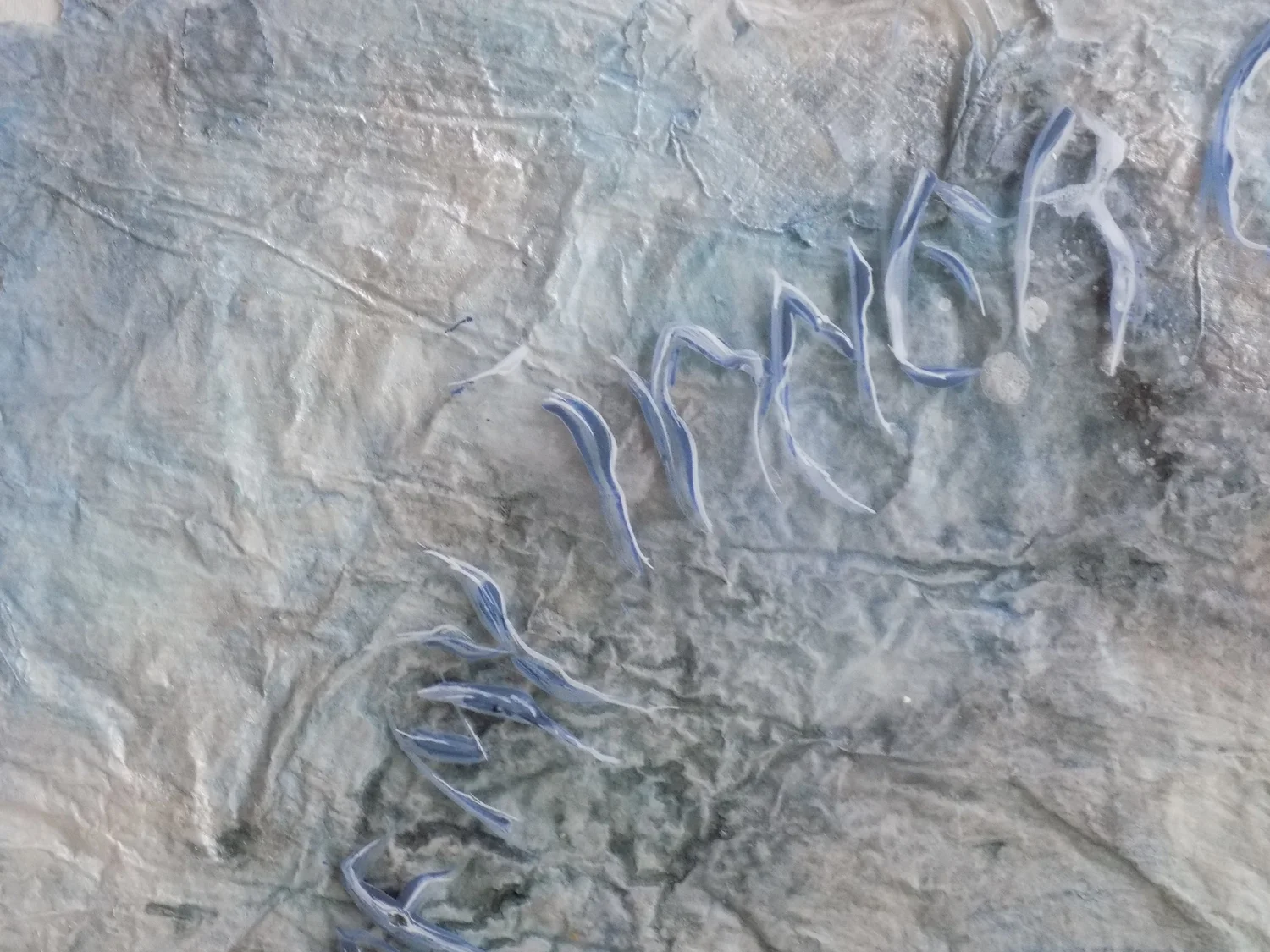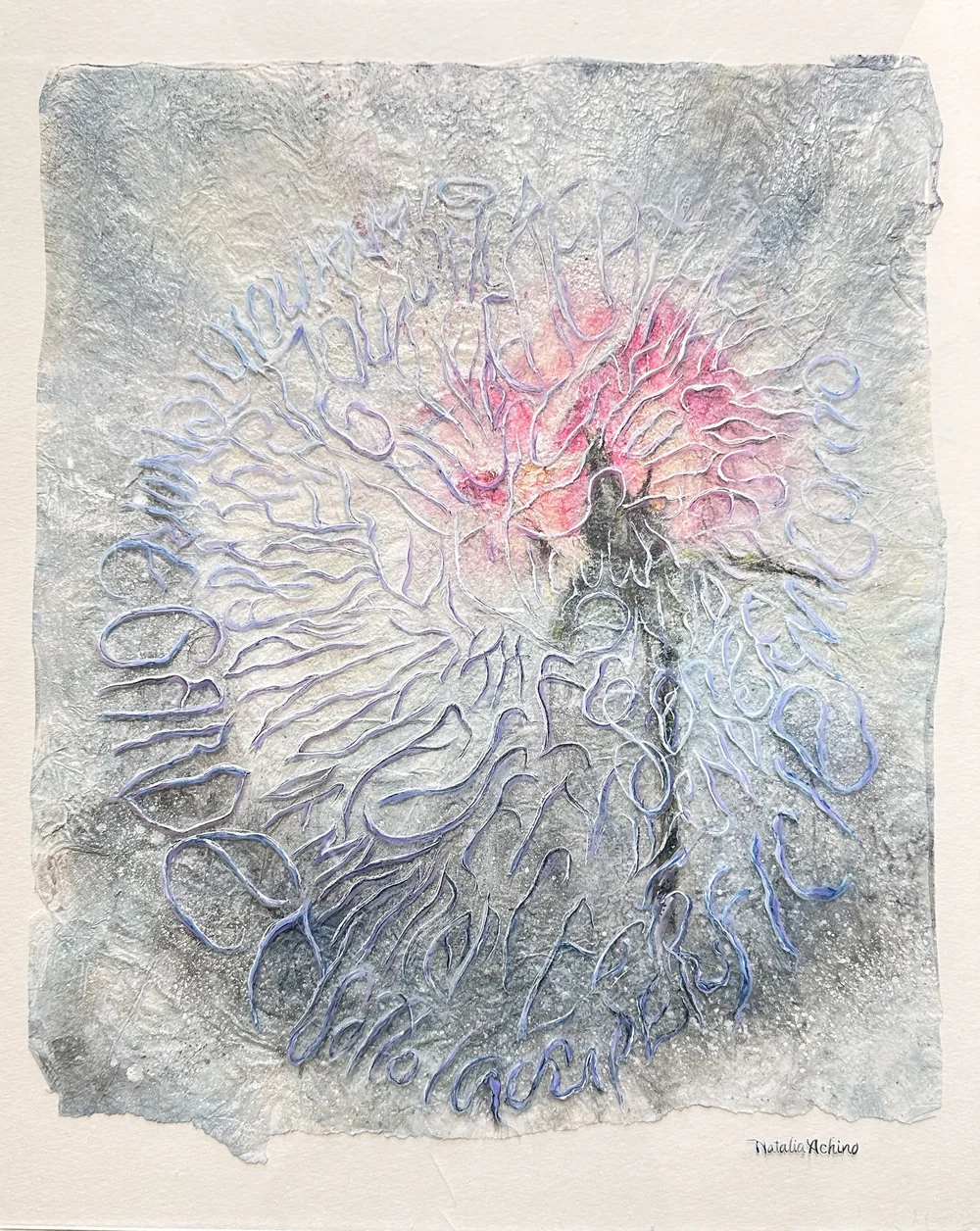 Created as part of the “Art of Letters: Symbiosis III” exhibition, Period of Quiescence II is the second work in Natalia’s calligraphic series, continuing her exploration of the frozen rosebud. Here, the form is almost entirely concealed beneath layers of text, shifting the focus toward what is obscured rather than revealed. Taking a more experimental approach, she works into the surface to recreate the depth and texture of ice, building the piece through layered acrylic sheets that introduce a sense of distance and enclosure. The lettering, adapted and translated into Italian and Spanish, becomes more dominant, overtaking what lies beneath and reflecting a state where something is held in suspension, not absent but not yet able to fully surface.