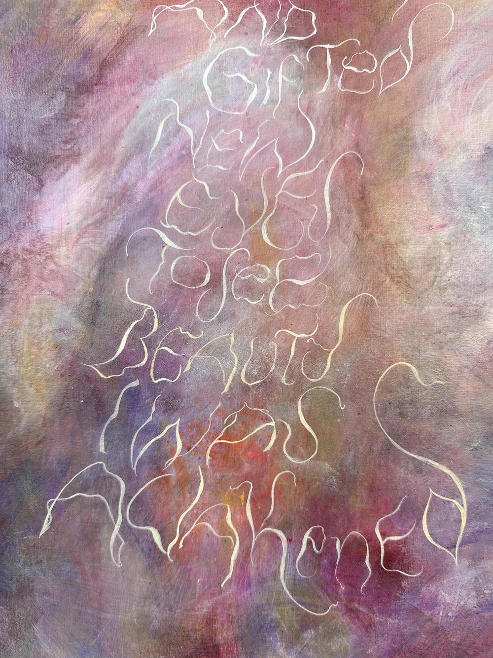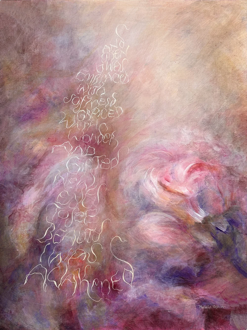 Created as part of the “Art of Letters: Symbiosis III” exhibition, Awakening reflects a turning point shaped by a near-death experience that brought a renewed sense of clarity and direction. The work carries a feeling of release and upward movement, as if something once held has begun to open and rise, marking a shift into a more conscious sense of self. It speaks to a moment of rebirth, where perception is softened and reformed, echoing the words within the piece: “And then I was embraced with softness, graced with wonder and gifted new eyes to see beauty. I was awakened.”