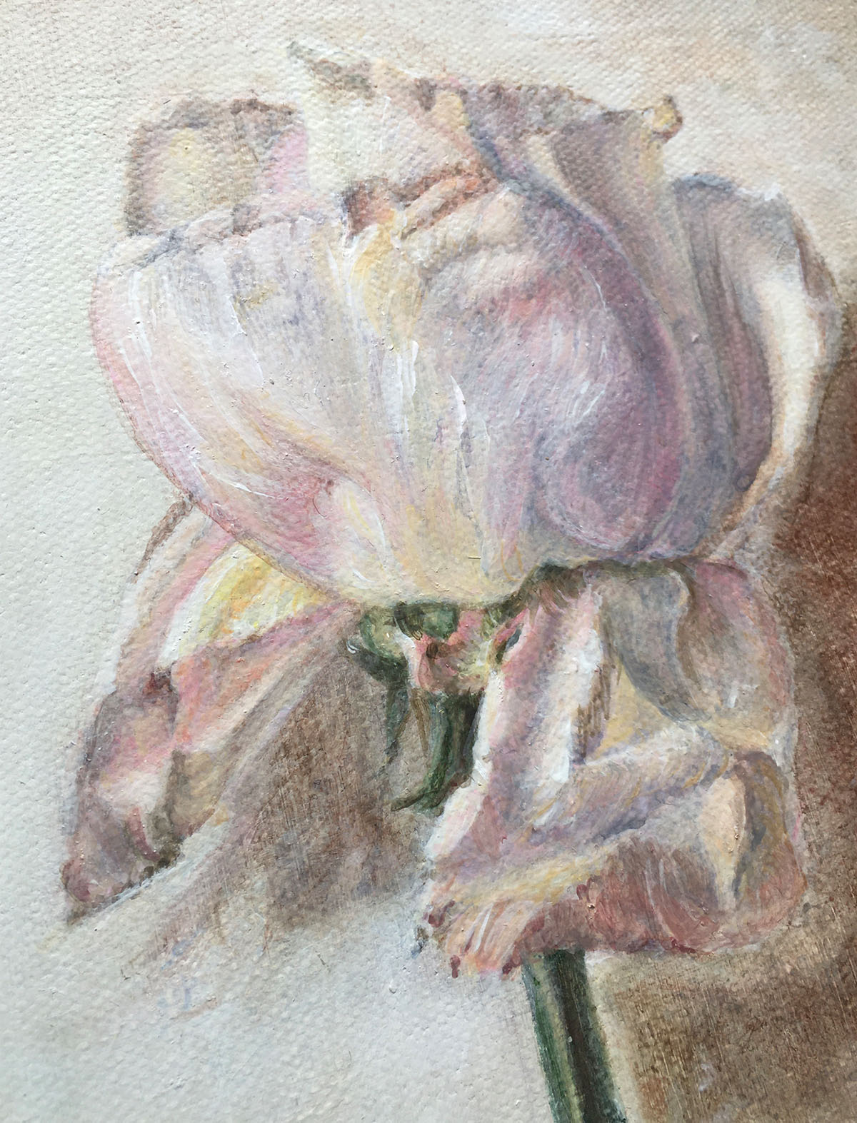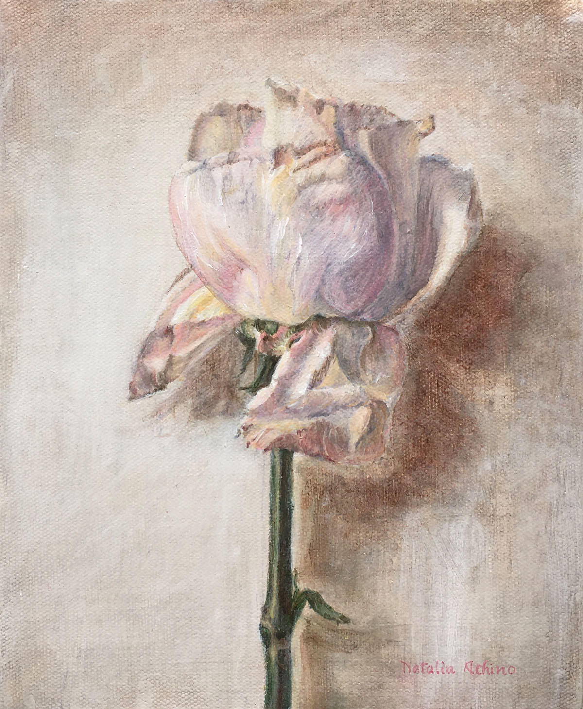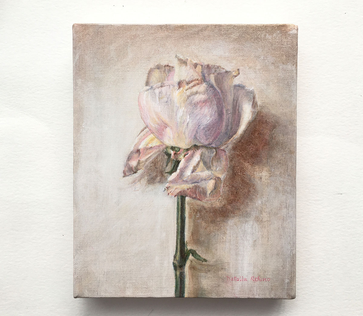 Set against a wall, the rose feels slightly removed from its surroundings, as if caught in a pause rather than a moment of action. There’s a softness to the way it sits within the space, not quite anchored, allowing the work to drift into something more contemplative without becoming distant. It holds that familiar feeling of being present but elsewhere, where attention loosens and the mind begins to wander.