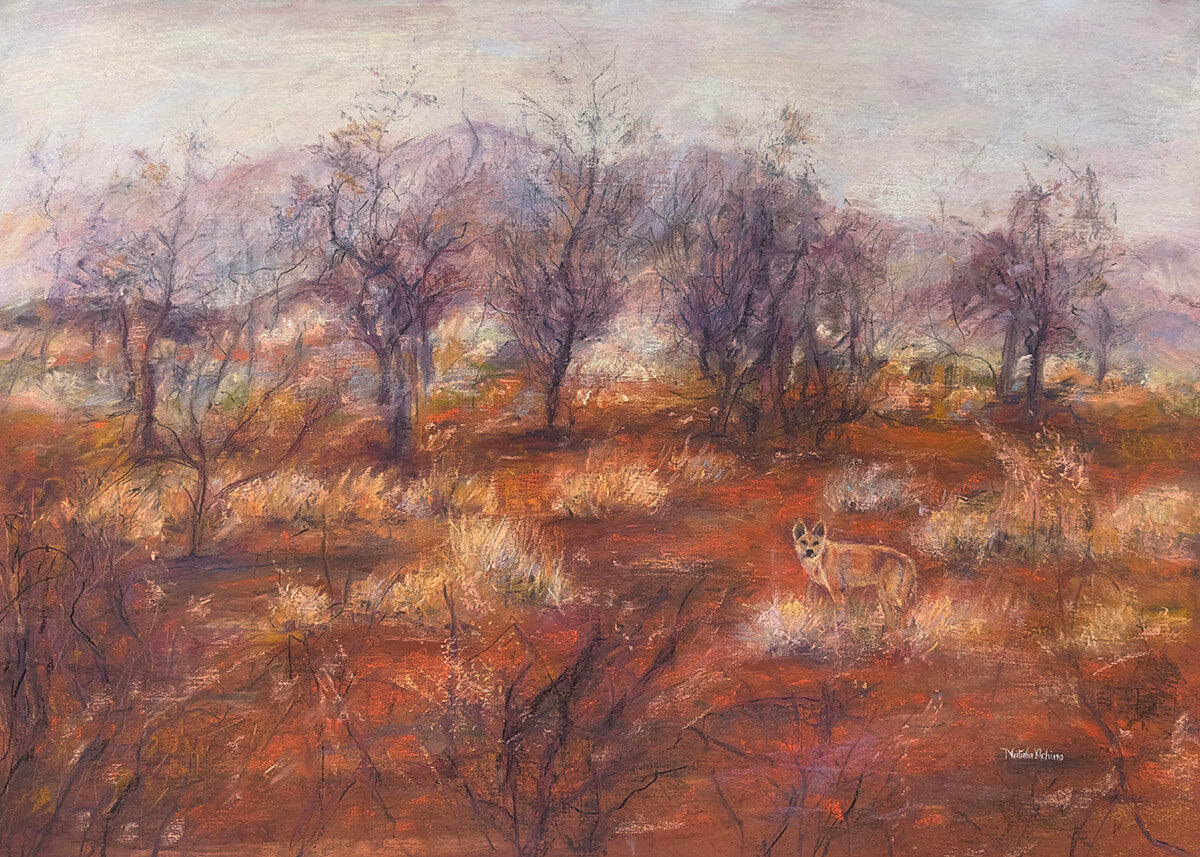 Reflecting a quiet reverence for the land, Pilbara Dingo is a homage to the enduring presence of the region. The dingo becomes a symbol of attentiveness and belonging, shaped by a landscape that feels both ancient and alive. The painting holds a sense of calm and restraint, exploring the relationship between place and identity, and the way the land itself carries memory.