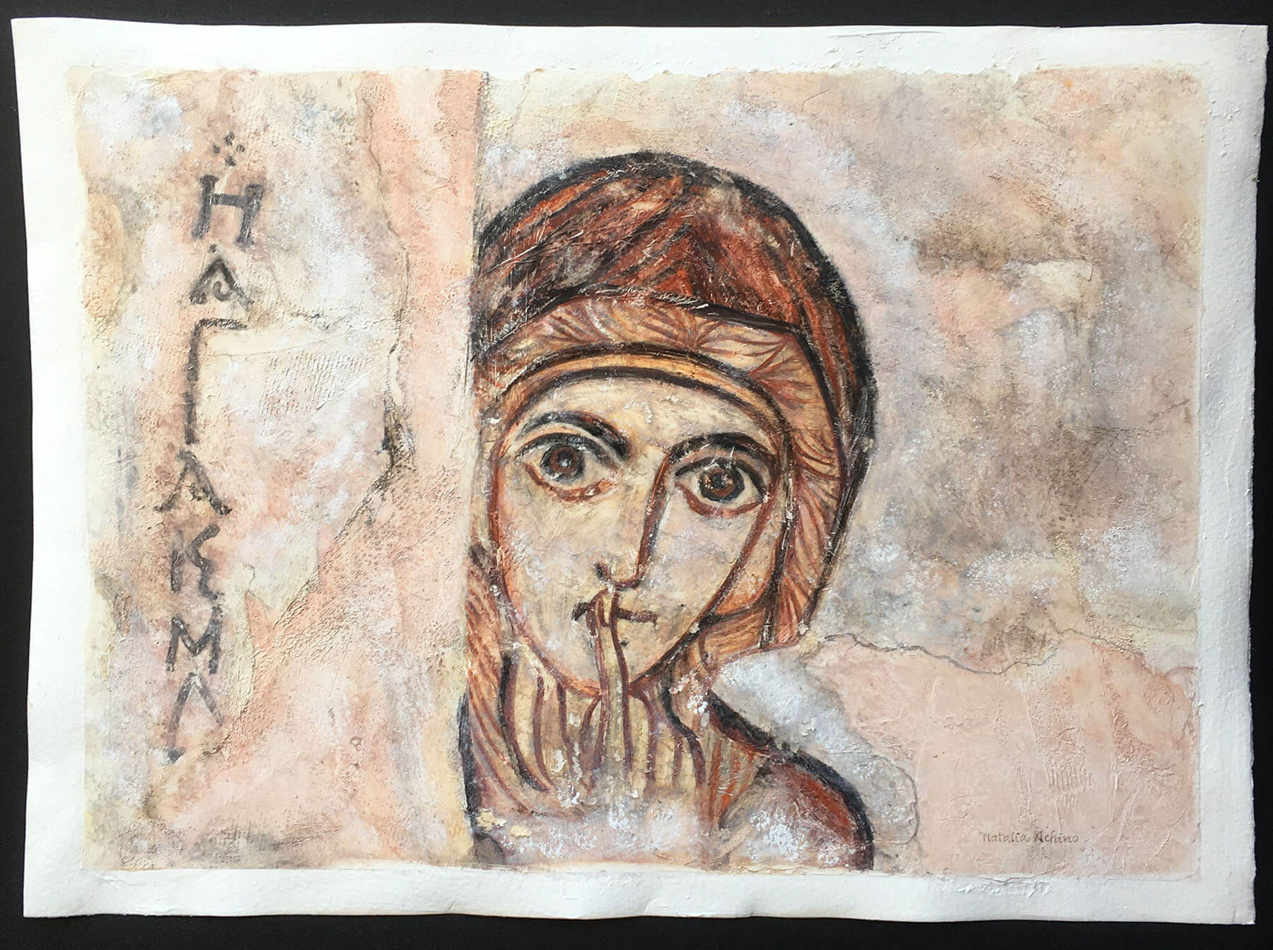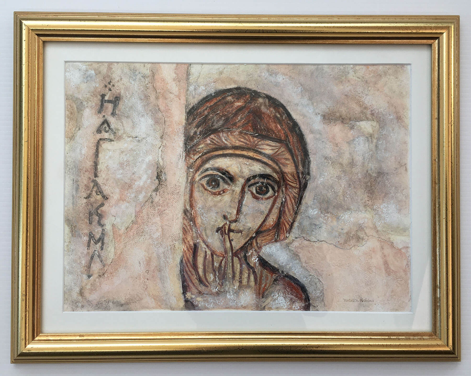 Drawing from an ancient illustration in Pompeii, the work reimagines Saint Anne through layered mark-making that echoes the texture and wear of the original. There’s a sense of continuity in the way the figure is held, as if time has passed through the surface rather than erasing it, allowing past and present to sit alongside one another. The piece carries a quiet reverence without feeling distant, grounded in the materiality of the medium while keeping a connection to the history it draws from.
